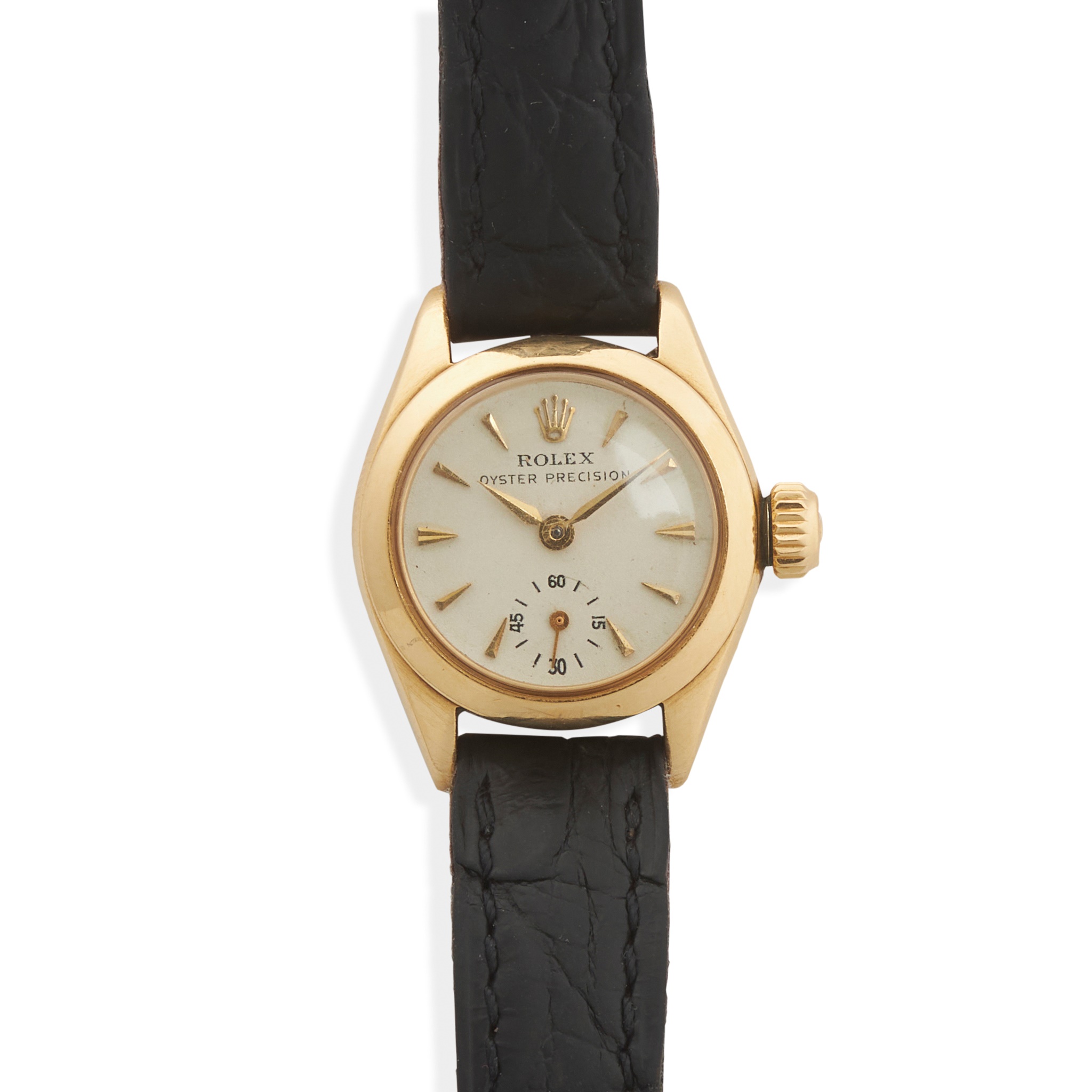 Oyster Perpetual Precision model 6522, 1957 from serial number, round white dial with applied bevelled wedge hour markers, small seconds at 6, gold bevelled sword hands, screw-down crown with coronet, on a generic black strap, no box and papers, with booklet