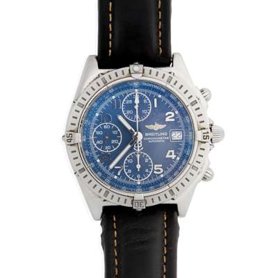 Chronomat model A13352, stainless steel case, automatic movement, signed round blue dial with applied stainless steel Arabic numerals, subsidiary dials at 12, 6 and 9 for 30 minute register, 12 hour register and small seconds, date aperture at 3, outer seconds track in white, raised outer tachymeter scale to the stepped dial edge, stainless steel pencil hands with lume inserts, centre seconds hand with lume insert pointer terminal and skeletonised Breitling 'B' and anchor logo to the other terminal, stainless steel bezel with count-up scale with lume plot at 12 and baton lume markers, screw-down onion crown with twin push-buttons to either side, with A13352 and 509716 to the caseback, on a generic leather strap, no box and papers