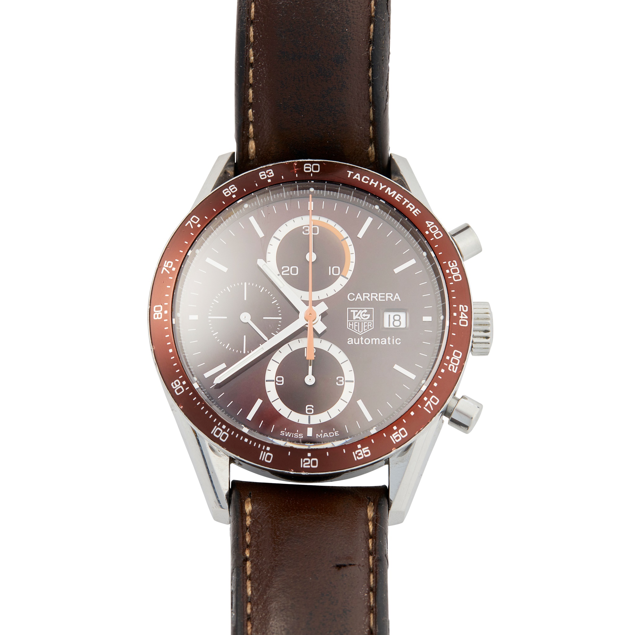 Carrera Automatic model no. CV2013-0, originally purchased 2007, stainless steel case, signed calibre 16 automatic movement, round deep brown dial with applied stainless steel baton hour markers, date aperture at 3, subsidiary dials at 1, 6 and 9 for 30 minute register, 12 hour register and small seconds, tapered stainless steel hands with lume inserts, orange centre seconds hand, outer seconds track in white, brown bezel with tachymeter scale, crystal caseback with the movement visible beneath, with RRU5158 to the case edge, on a brown leather strap with signed foldover deployant TAG Heuer clasp with W7 to the interior, in box, with outer box, with guarantee card and booklets