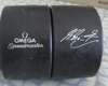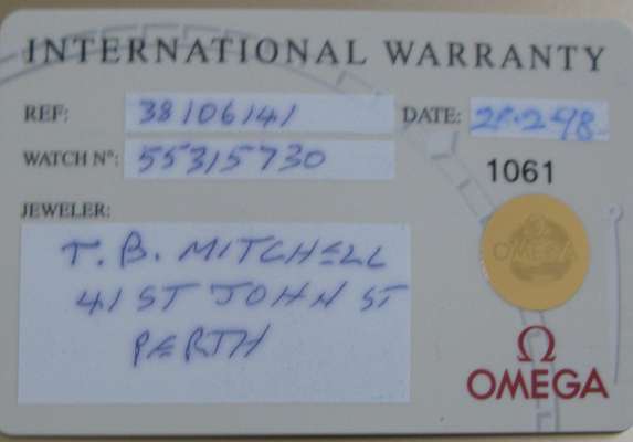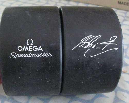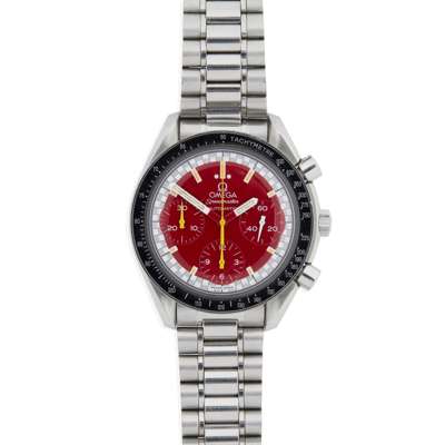 Speedmaster Professional Automatic Schumacher edition model 38106141, 1998 from warranty card, round red dial with orange baton hour markers, subsidiary dials at 3, 6 and 9 for small seconds, 12 hour register and 30 minute register, domino-style outer seconds track in black to a white background, red and white pencil hands with lume inserts, black enamel bezel with tachymeter scale, the caseback with hippocampus, Omega logo and SPEEDMASTER along with serial number, on a stainless steel bracelet strap with central polished half-barrel links flanked by satin finish half-barrel links, with 813 to the end links, a signed clasp with Omega logo and 'Speedmaster,' also marked 32 and 1469, in presentation box taking the form of two tyres, with outer box, with warranty card