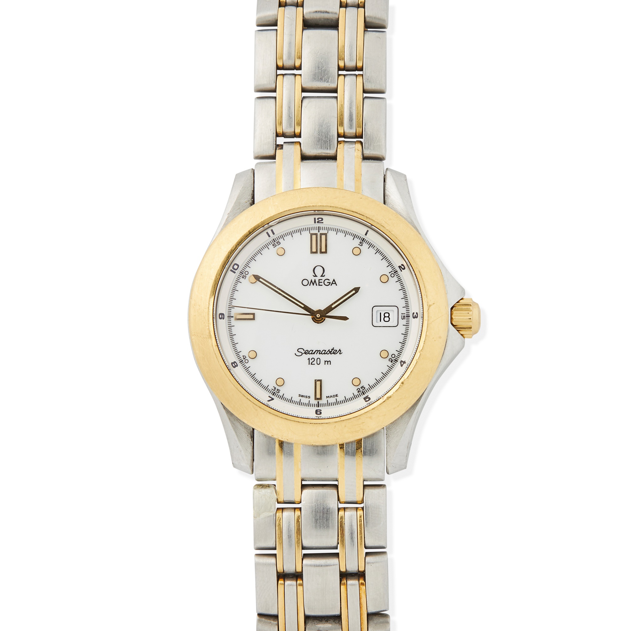 Seamaster 120m model, stainless steel case, signed Omega 1438 quartz movement numbered 1487 2272, round white dial with applied dot and baton hour markers, date aperture at 3, outer seconds track with Arabic numerals in black, raised track with Arabic numerals to the bevelled dial edge, gold hands with lume inserts, centre seconds hand, gold bezel, the caseback with SEAMASTER and hippocampus motif along with Omega logo within textured wave pattern circle, gold screw-down crown with Omega logo, on a stainless steel and gold bi-colour bracelet with signed Omega clasp numbered 1501/823, no box and papers