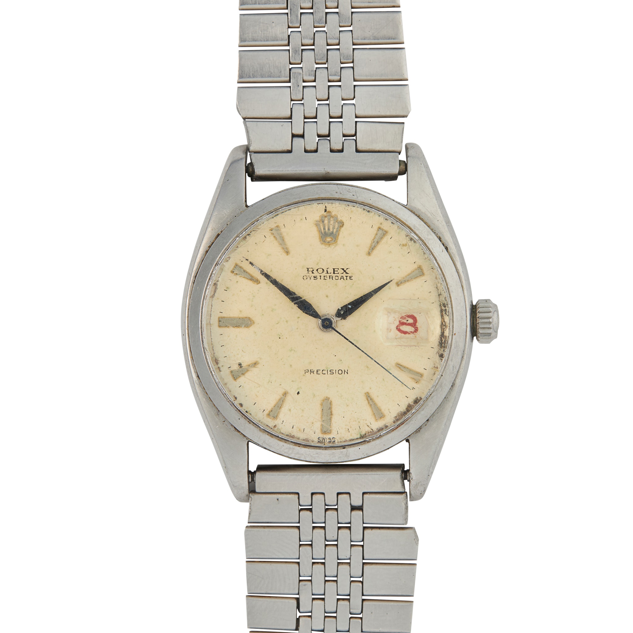 Oysterdate Precision model no. 6494, 1959 from serial number, round white dial with applied wedge hour markers, date aperture at 3, black sword hands, black centre seconds hand, screwdown crown with coronet, caseback missing, on a later generic bracelet strap, no box and papers