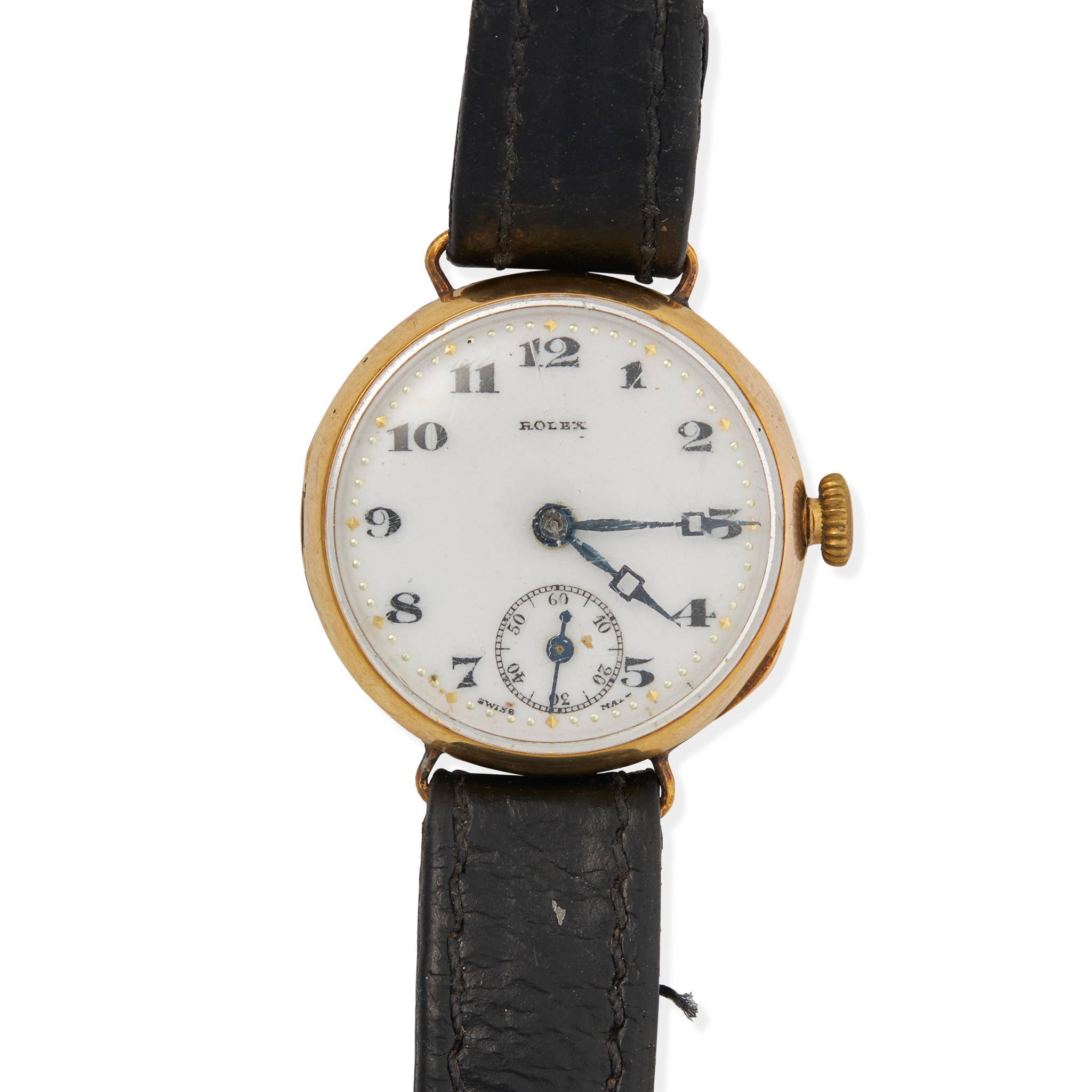 9ct gold case, Rolex signed 15 jewel movement, round white enamel dial with Arabic numerals in black, small seconds at 6 with Arabic numerals and railroad border, gold and silver dot outer seconds track, fancy blued steel hands, the inside caseback with R.W.C.Ltd, 9.375, ROLEX WORLD'S RECORDS, GOLD MEDAL, GENEVA-SUISSE 4222, on a generic strap, no box and papers