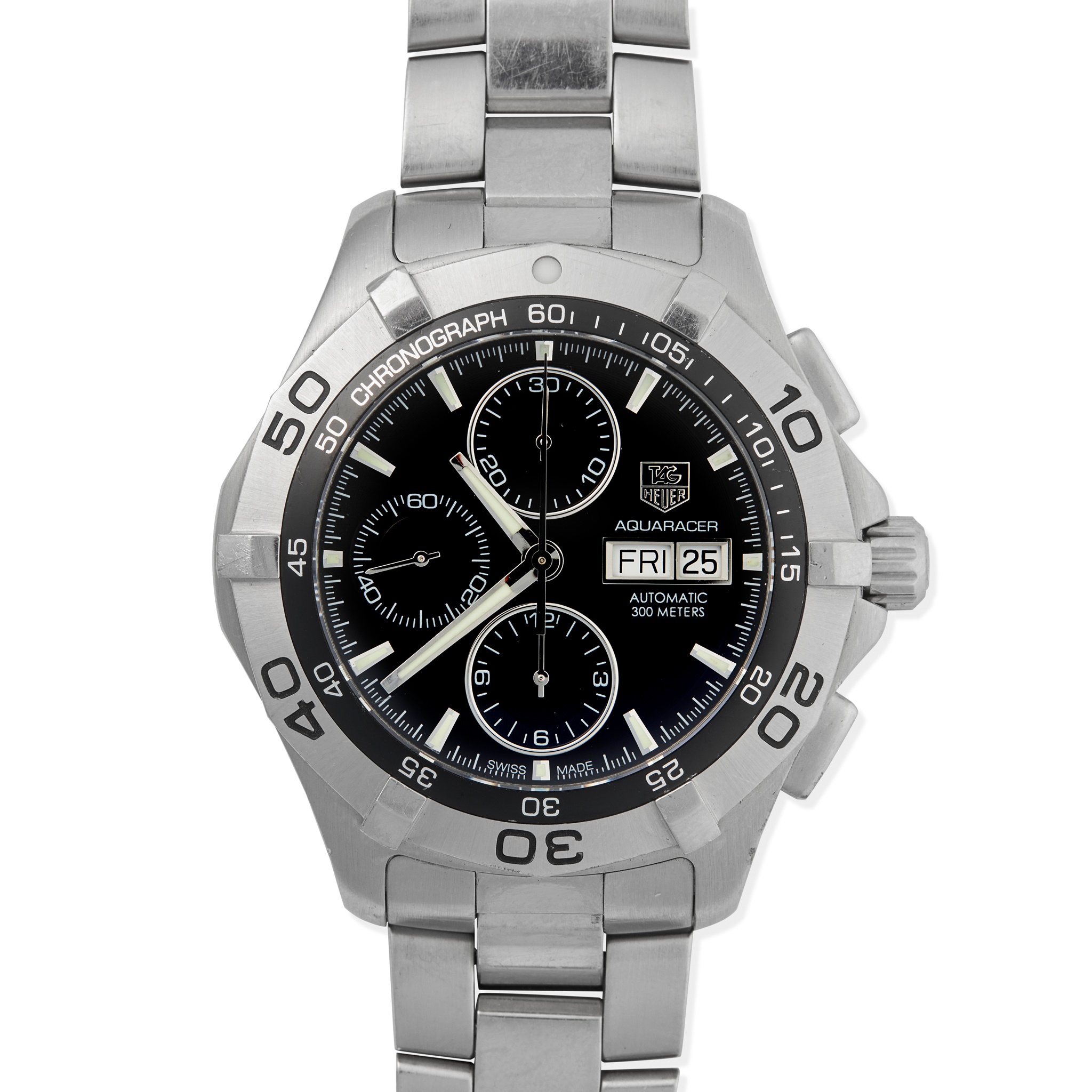 Aquaracer Automatic 300 Meters model no. CAF2010, stainless steel case, signed calibre 16 automatic movement, round black dial, applied wedge lume hour markers, day and date apertures at 3, subsidiary dials at 12, 6 and 9 for 30 minute register, 12 hours, and small seconds, lume pencil hands, centre seconds hands, stainless steel bezel with ceramic insert with count-up scale, further larger count-up scale with Arabic numerals in black, caseback with FM7430, on a stainless steel bracelet strap with signed TAG Heuer foldover clasp, no box and papers