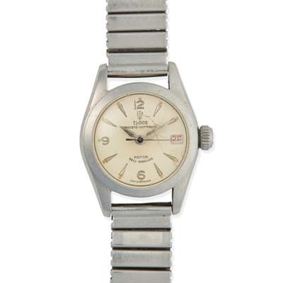 Princess-Oysterdate model 7907, 1956/7 from serial number on caseback, stainless steel case, automatic movement, signed round white dial with applied stainless steel arrowhead hour markers, with lume plots to the outer terminals, date aperture at 3, sword hands with lume inserts, centre seconds hand in black, screw-down crown with coronet, caseback with 7907 178897, on a later generic expanding bracelet strap, no box and papers