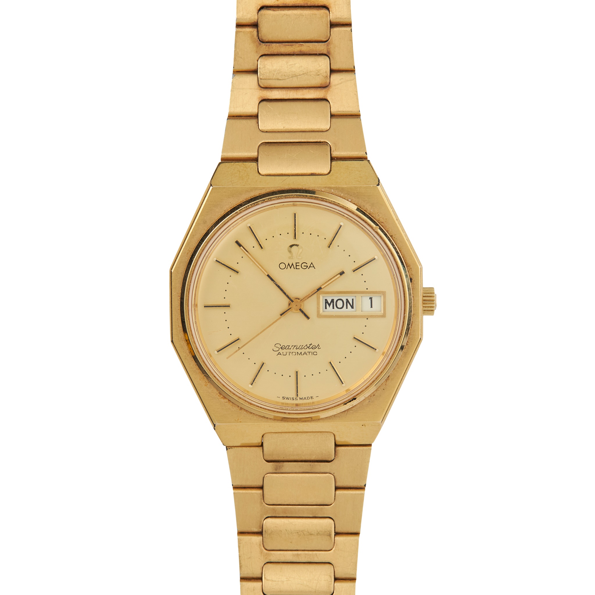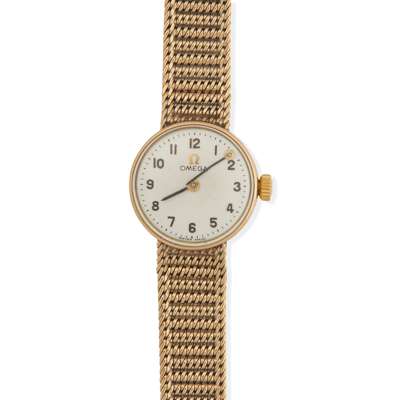 to include a gentleman's Seamaster Automatic model, octagonal gold plated case, signed Omega 1020 automatic movement, round gold-coloured dial with applied baton hour markers, day and date aperture at 3, gold-coloured hands with lume inserts, on a gold plated bracelet strap with signed Omega clasp numbered LD.1329.313, no box and papers; and a lady's example with 9ct gold case, signed Omega calibre 620 manual wind movement, signed dial with applied Arabic numerals in black, outer seconds track, pencil hands, on an integrated mesh bracelet strap, no box and papers