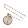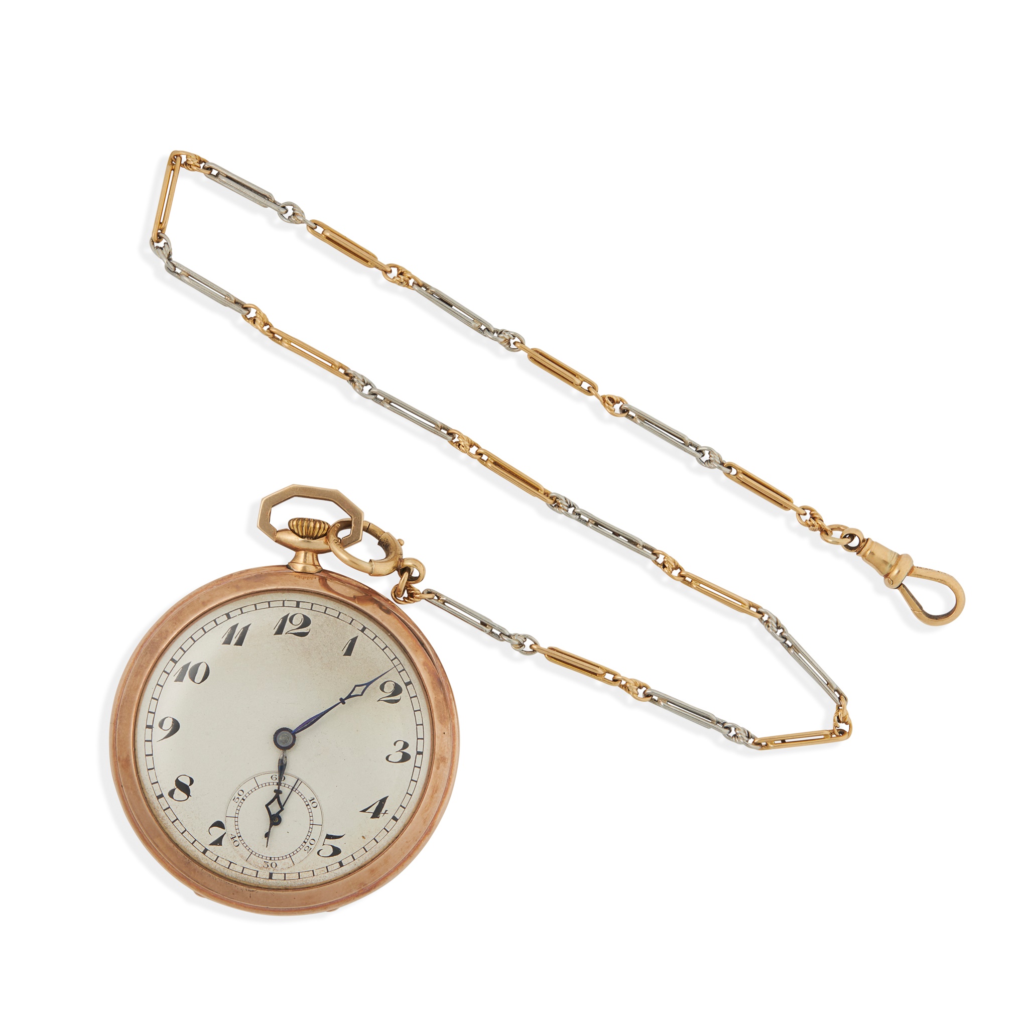 open face, keyless wind, movement marked ASTER, the round dial with Arabic numerals in black, small seconds at 6, railroad outer seconds track in black, the caseback with engraved monogram, case marked for 9ct gold, with a short art deco bi-colour double-fetter link chain marked 18ct to the dog clip clasp, also with a round spring clasp, with partial marks