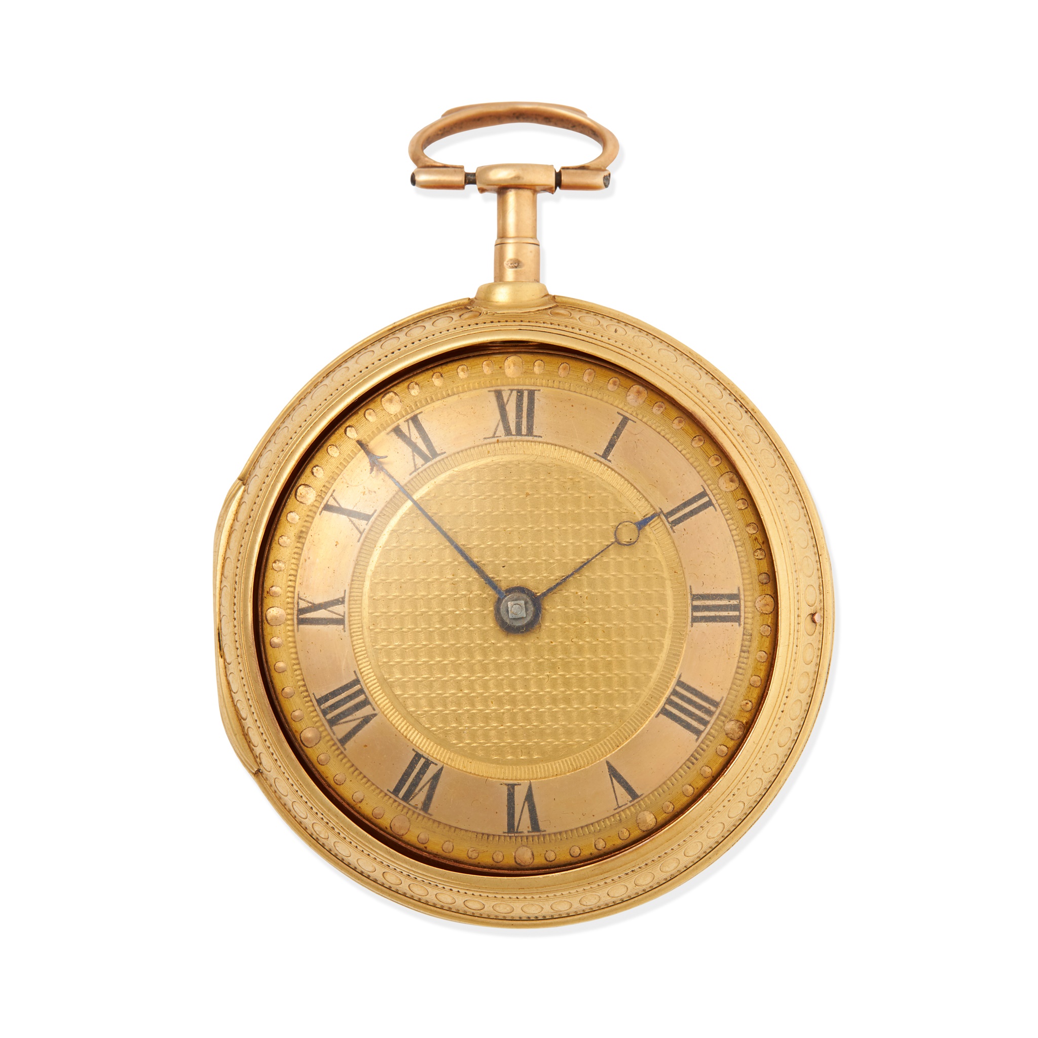 18ct gold inner and outer cases, fusee movement with cover inscribed 'Geo. Jeffreys. No. 7062 London,' round gold dial with central machined section, Roman numerals in black, Breguet style hands, the outer case with decorative engraving, both cases with full London hallmarks for 1796, makers mark SG