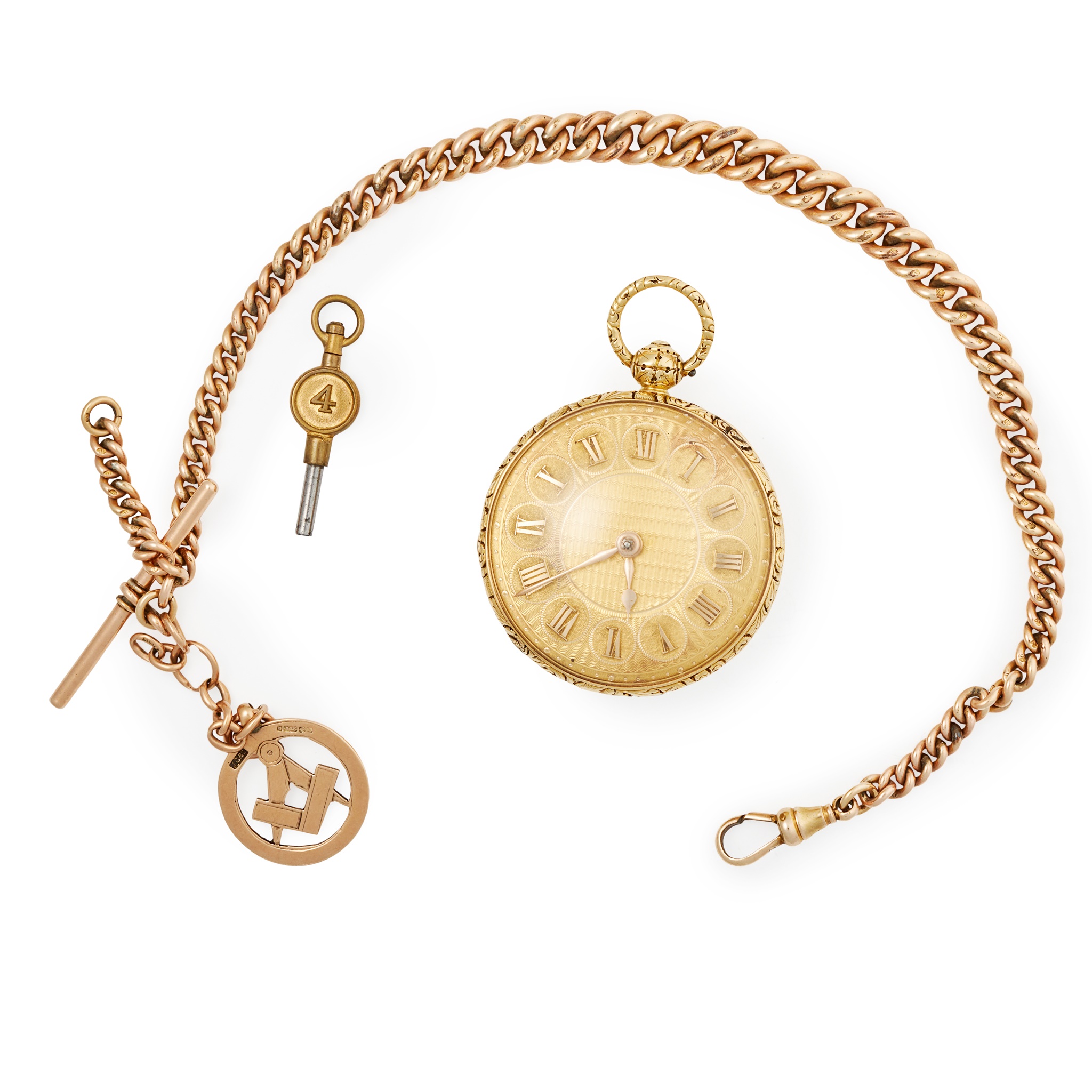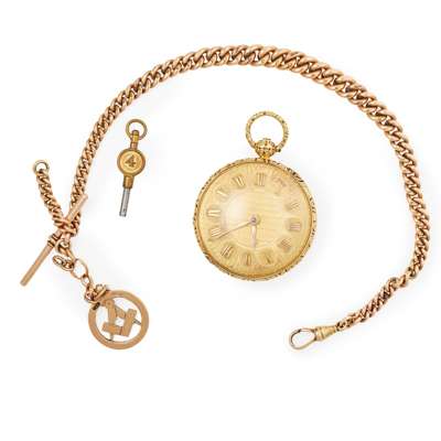 open face, key wind, full plate movement signed Goodhugh, London, no.697, round gold-coloured dial with Roman numerals also gold-coloured, central machined section, gold leaf hands, with partial hallmarks to the interior, possibly for Sheffield, in a fitted case; along with a plated single Albert chain formed by graduated curb links, with a 9ct fob appendage