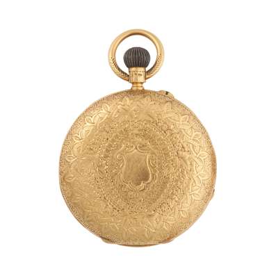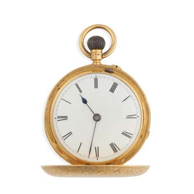 full hunter, keyless wind, 18ct gold case, 3/4 plate movement signed Ja. Ritchie & Son, Edinburgh, round white enamel dial with Roman numerals in black, railroad outer seconds track also in black, blued steel leaf hands, with partial hallmarks, possibly for Sheffield