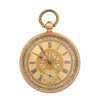 open face, key wind, unsigned 3/4 plate movement, round gold-coloured dial with central section featuring raised tri-colour floral motif decoration, Roman numerals in black, small seconds at 6, leaf hands, the caseback and edges with engraved decoration all over, the case marked 14k