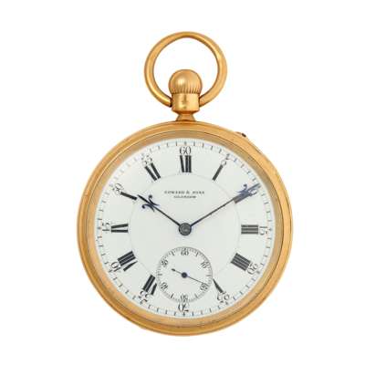 open face, keyless wind, 18ct gold case, 3/ 4 plate movement signed Edward & Sons, 92 Buchanan Street Glasgow and with Royal Warrant badges, round white enamel dial with Roman numerals in black, sunken small seconds at 6, railroad outer seconds track in black with Arabic numerals, blued steel fleur-de-lis hands, with full London hallmarks for 1902