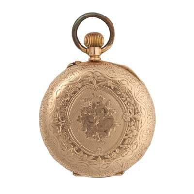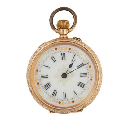 open face, keyless wind, unsigned movement, round white enamel dial with Roman numerals in black, railroad outer seconds track in black, with decoration in red and gold to the outer edge, marked 14k