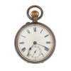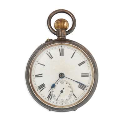 silver case, open face keyless wind, 3/4 plate movement marked MOERI'S PATENT, round white enamel dial with Roman numerals in black, sunken small seconds at 6, railroad outer seconds track in black, blued steel leaf hands, brass crown, the caseback with machined engraving and central monogram, the inside caseback with import marks for silver, in a fitted velvet and silk-lined leather case retailed by Carrington & Co. of Regent Street