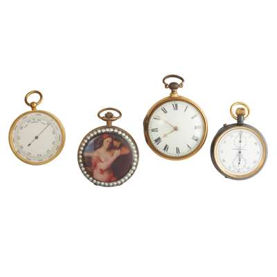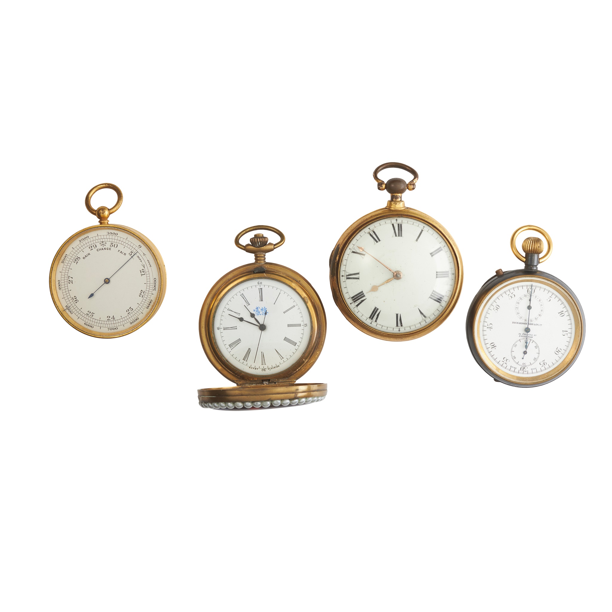 to include a pair cased watch, metal cases, the movement signed Grandhurst 1797; a metal pocket watch with faux pearls to the case; a gun metal stop watch, the dial signed Richardson Adie & Co. Edinburgh; and a case pocket barometer
