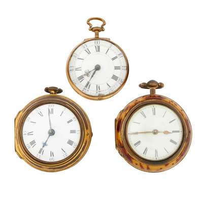 to include a gilt metal example, the fusee movement signed Geo. Thatcher, Cranbrook; another gilt metal example with fusee movement signed B. Clay, London, with gilt outer case; the last lacking its outer case, the fusee movement signed A. Mico, London