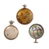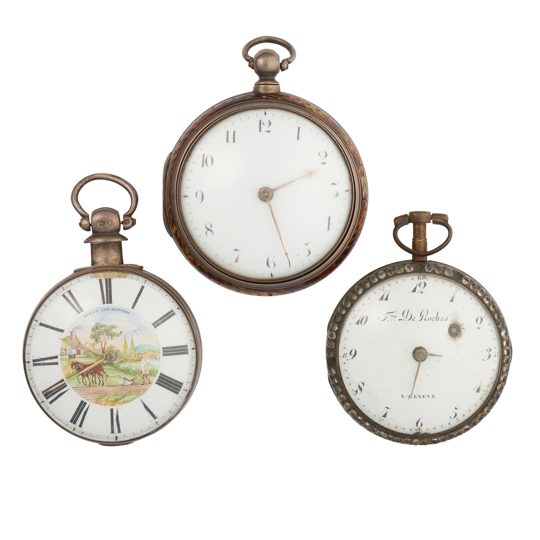 to include a metal example with white dial signed Fres. de Roches, with painted caseback depicting a courting couple; a silver pair case example lacking outer case, the movement signed Fred. Chenery Bungay, with full Birmingham hallmarks for 1847; and another pair case example with painted outer case, with full London hallmarks for 1815