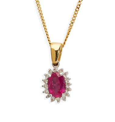 claw set with an oval-cut pink sapphire in a border of small round brilliant-cut diamonds, to a 9ct gold flattened trace link chain