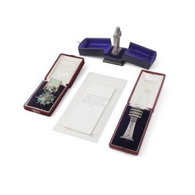 cased Insignia of the Third Class of the Imperial Ottoman Order of the Osmanieh with the corresponding paperwork; a cased silver model of an Egyptian pillar, the top with four tiers, and Egyptian hieroglyphs to the front, the rear engraved "Isna Barrage, opened by HH The Khedive, Feb 9th 1909, G. S. Perry Souvenir from Ransomes and Rapier Ltd, Ipswich" in a fitted case for Lamberts of London; a cased presentation model of the standing Egyptian god Hapi, commemorating the heightening of the Assouan dam opened in 1912