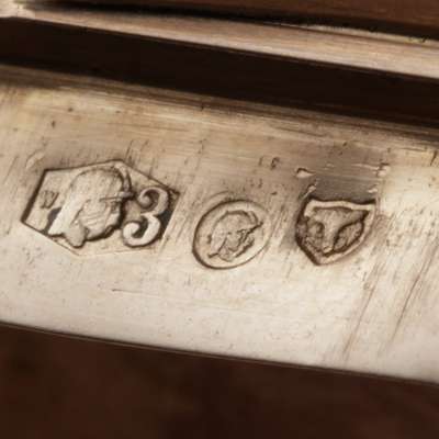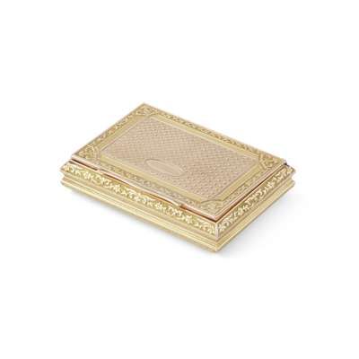 of rectangular outline with a bombé waist, the hinged lid, sides and base with panels of engine-turning, within slightly raised foliate borders, with a moulded thumbpiece, all in the French 18th century style