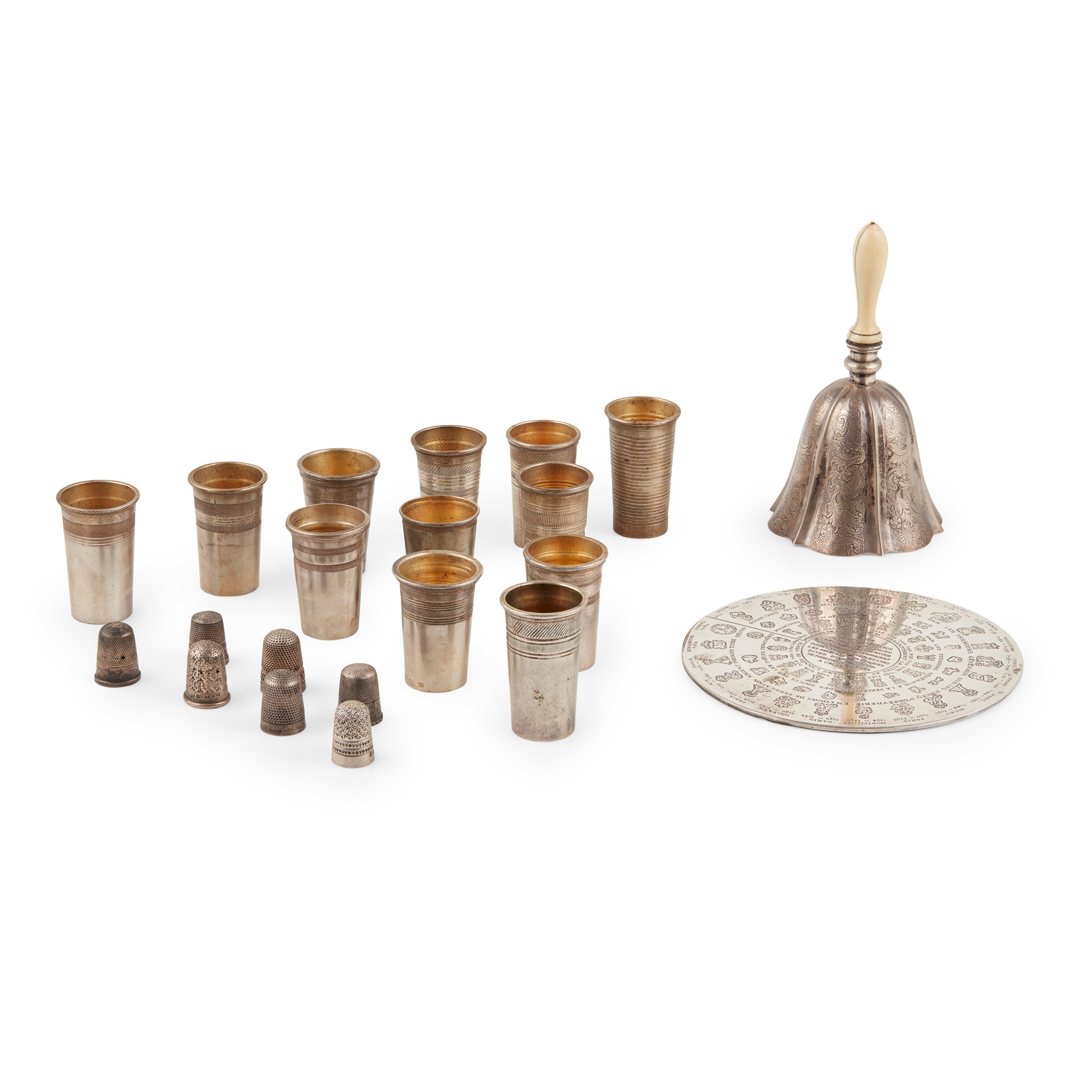 apparently unmarked, circa early 19th century, of lobed shape, engraved decoration, turned ivory handle; together with a Christofle plated teapot stand, engraved with French silver marks; and a group of small Scandinavian beakers in white and base metal, inset to the base with coins