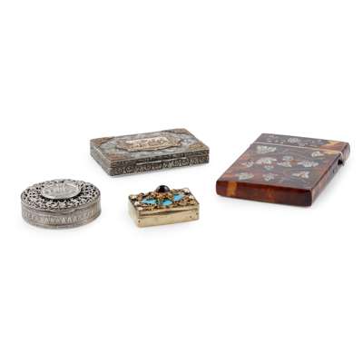 to include a small Swedish gilt patch box, with import marks, the hinged cover with central oval cabochon, enamel and seed pearl set ground; a circular box, indistinctly marked, the hinged cover with a central motif of a longship with a filigree floral border; the third a small table snuff box, incuse mark SIAF, of rectangular form, the hinged cover with an applied gilt central panel and corner detail; a late Victorian tortoiseshell and mother of pearl inlaid card case