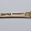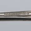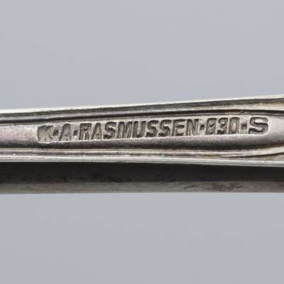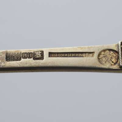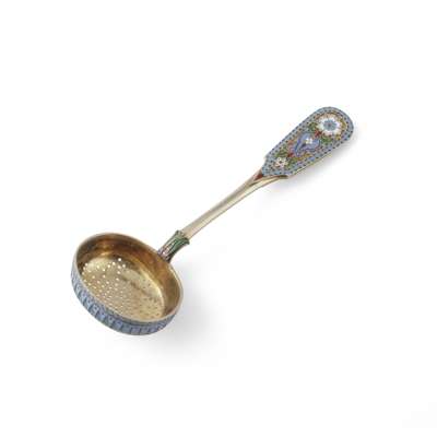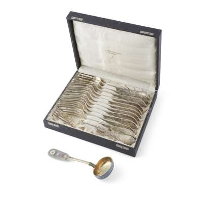 Ovchinnikov, Moscow circa 1850, of Fiddle pattern, champlevé enamel to each side and the reverse of the pierced bowl, together with a cased set of twelve table forks, A Rasmussen, of Pointed End pattern, cast scrolling border, engraved monogram and dated 1914, in fitted box retailer of K Staudenmann, Trondheim