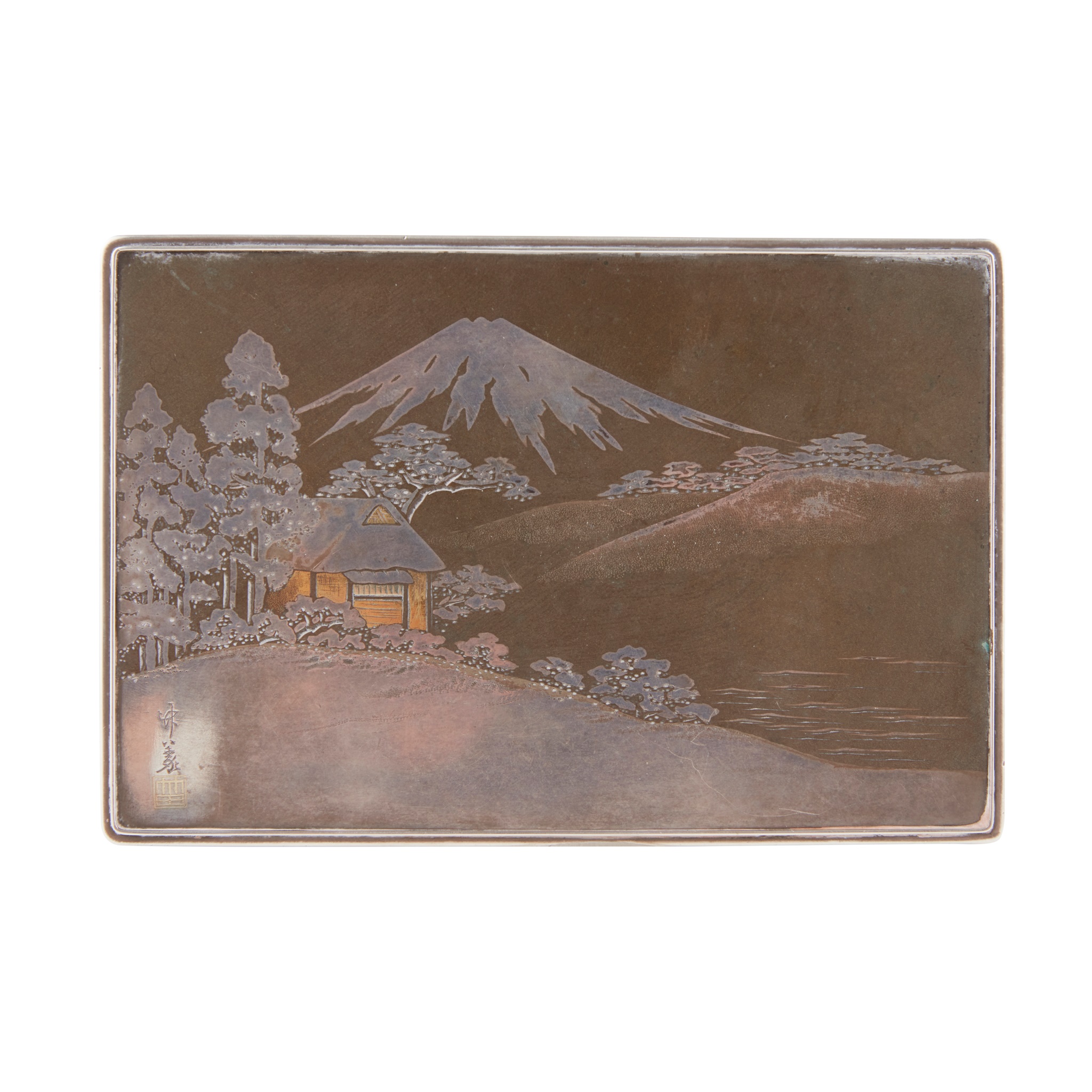 signed, of rectangular form, the pull-off lid with the mixed metal view of Mount Fuji, the base also wood-lined and of plain rectangular form