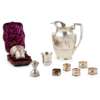 Theodore B Starr, early 20th century, two-pint size, oval shape, demi ribbed lower half, angular handle, large pouring lip with threaded detail; together with a cased Victorian small cream jug, sugar basin and tongs, all over chased decoration in the Persian style, fitted case; with a group of five napkin rings; a capstan pepper mill and a small French 19th-century beaker
