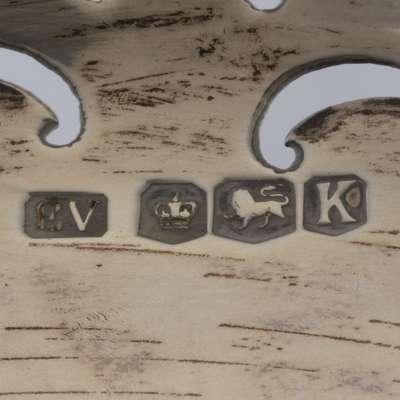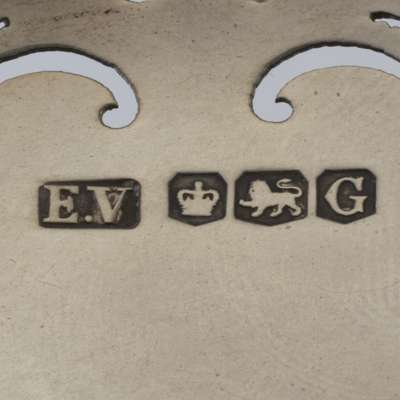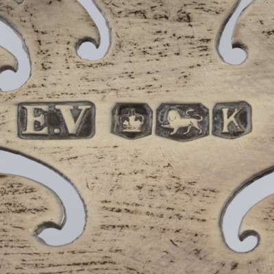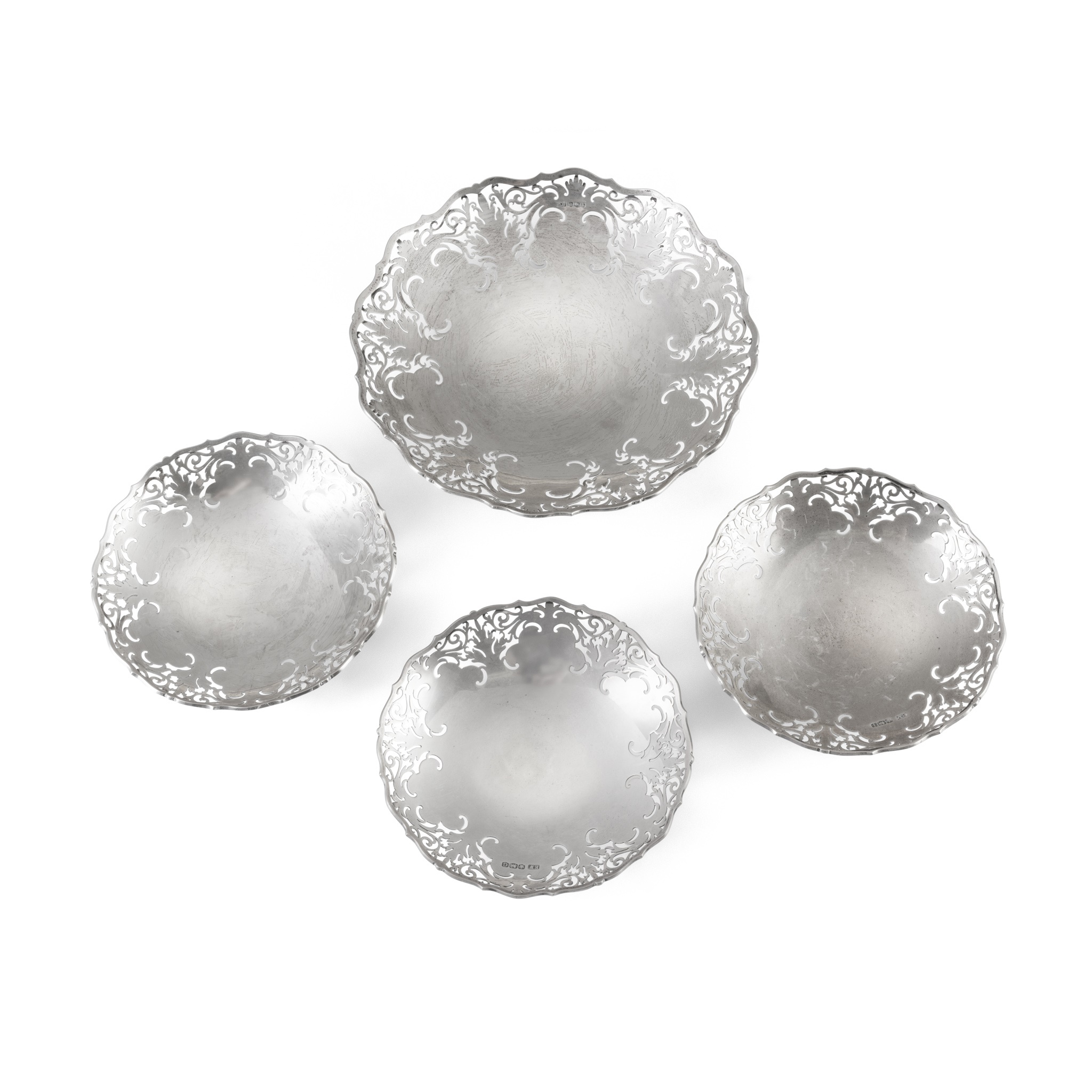 Viner's Ltd, Sheffield 1952, of moulded circular outline, pierced scroll border, raised on a circular rim foot; together with a matched set of three smaller versions also by Viners