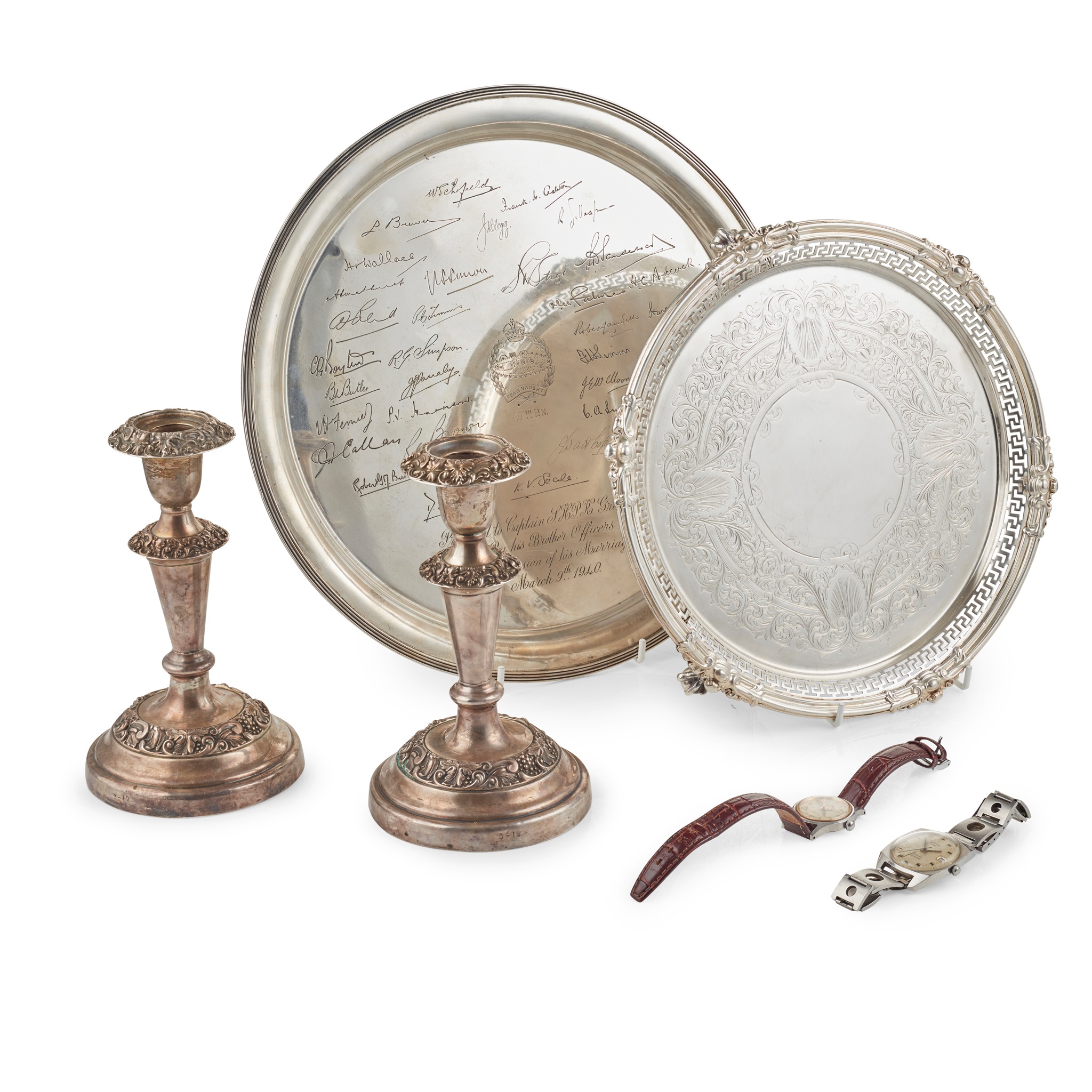 Atkin Brothers, Sheffield 1939 of circular form, facsimile signatures engraved to flat with an engraved motto for the 47th Battalion and presentation inscription dated 1940; together with another salver indistinctly marked with pierced raised border, a pair of dwarf table candlesticks, Birmingham 1901 with embossed vine borders and two wristwatches (Roamer and Rotary)