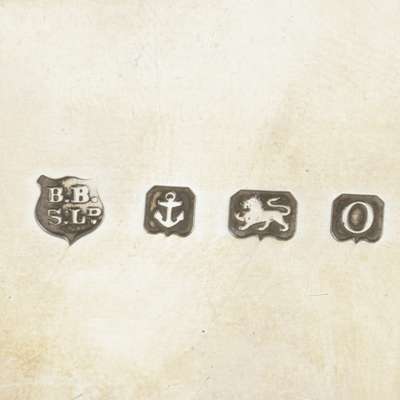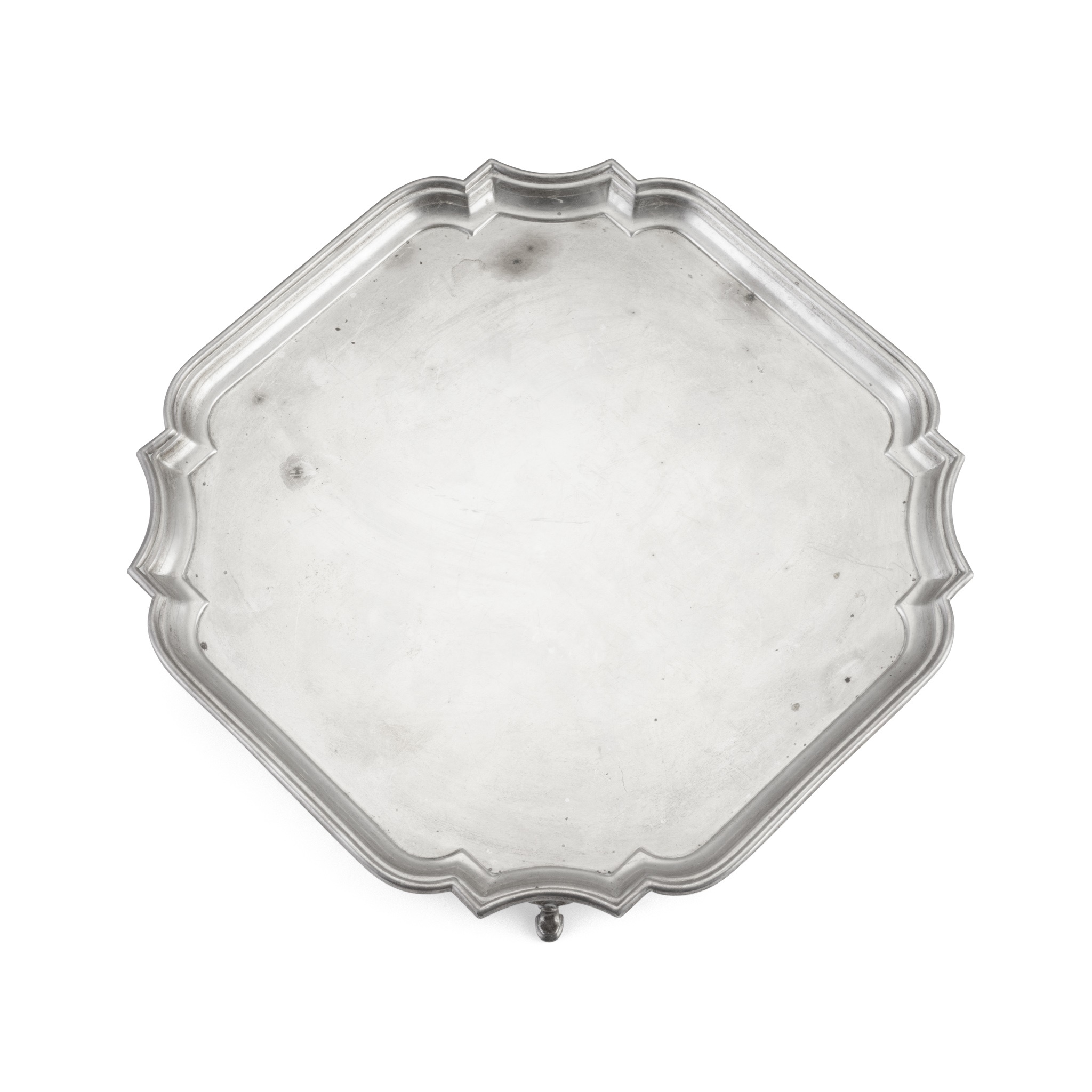 Barker Brothers Silver Ltd, Birmingham 1938, of moulded square outline with raised border, raised on four hoof feet