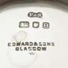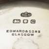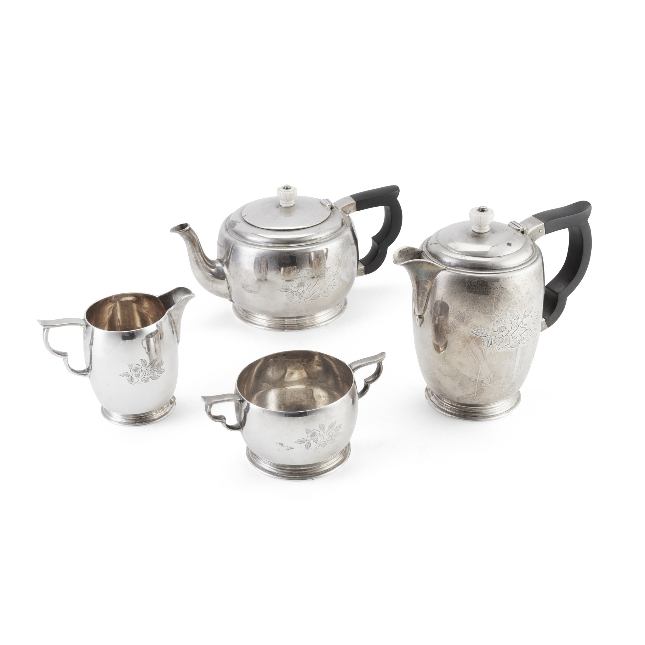Edward and Sons of Glasgow, London 1937/38, comprising, a waterpot, teapot, twin-handled sugar basin and milk jug, all of plain bulbous form with an engraved floral motif to centre, moulded handles and all raised on a stepped circular foot, with turned ivory finials