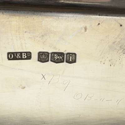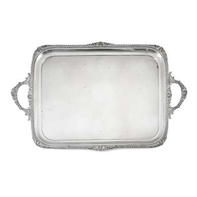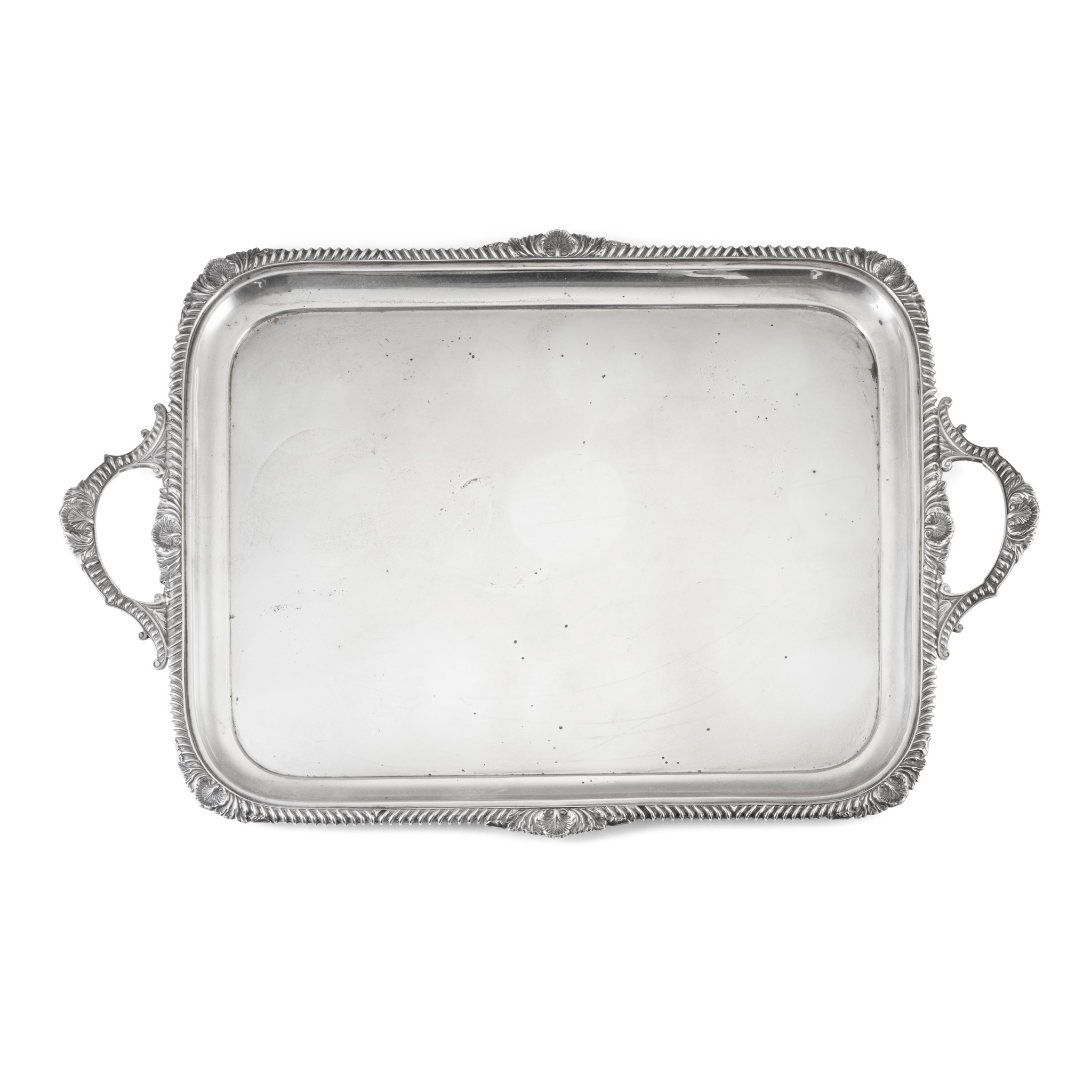 Ollivant & Botsford, Sheffield 1926, of rectangular outline with gadrooned border and cast shell corners, the cast oval handles with similar decoration