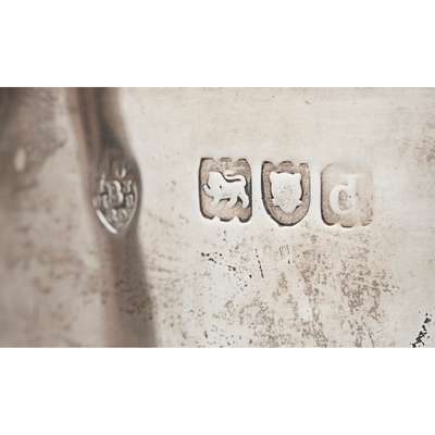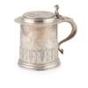 Edward Barnard and Sons Ltd., London 1899, of cylindrical form, engraved crest and motto to centre, chased leaf clasped border to stepped foot, the hinged lid with chased spiralling floral decoration, cast scroll thumbpiece to an S scroll handle with heart terminal