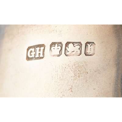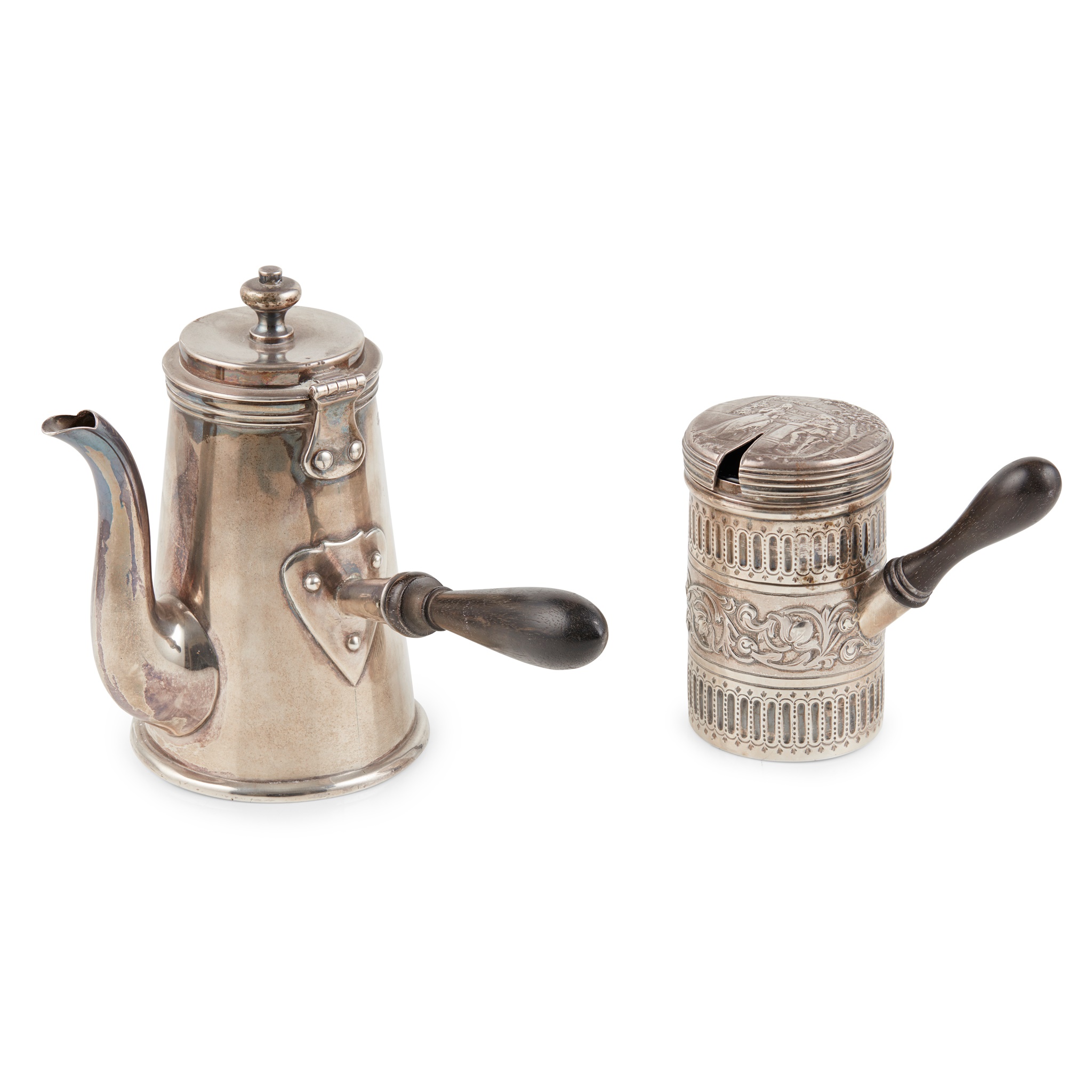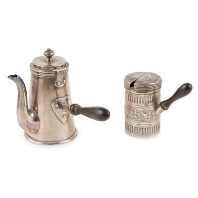 Hutton of Sheffield, plain tapering form, stepped hinged cover and finial, side turned wood handle, together with a late Victorian preserve pot of unusual design, John Septimus Beresford, London 1880, loosely in the Dutch style, the hinged cover with figures in a garden, the body with a central band of scrolling foliage and fluted borders, turned wood side handle, blue glass liner