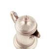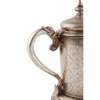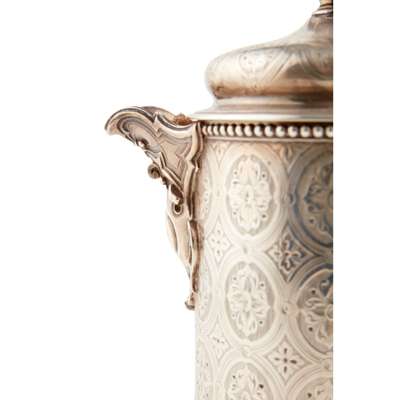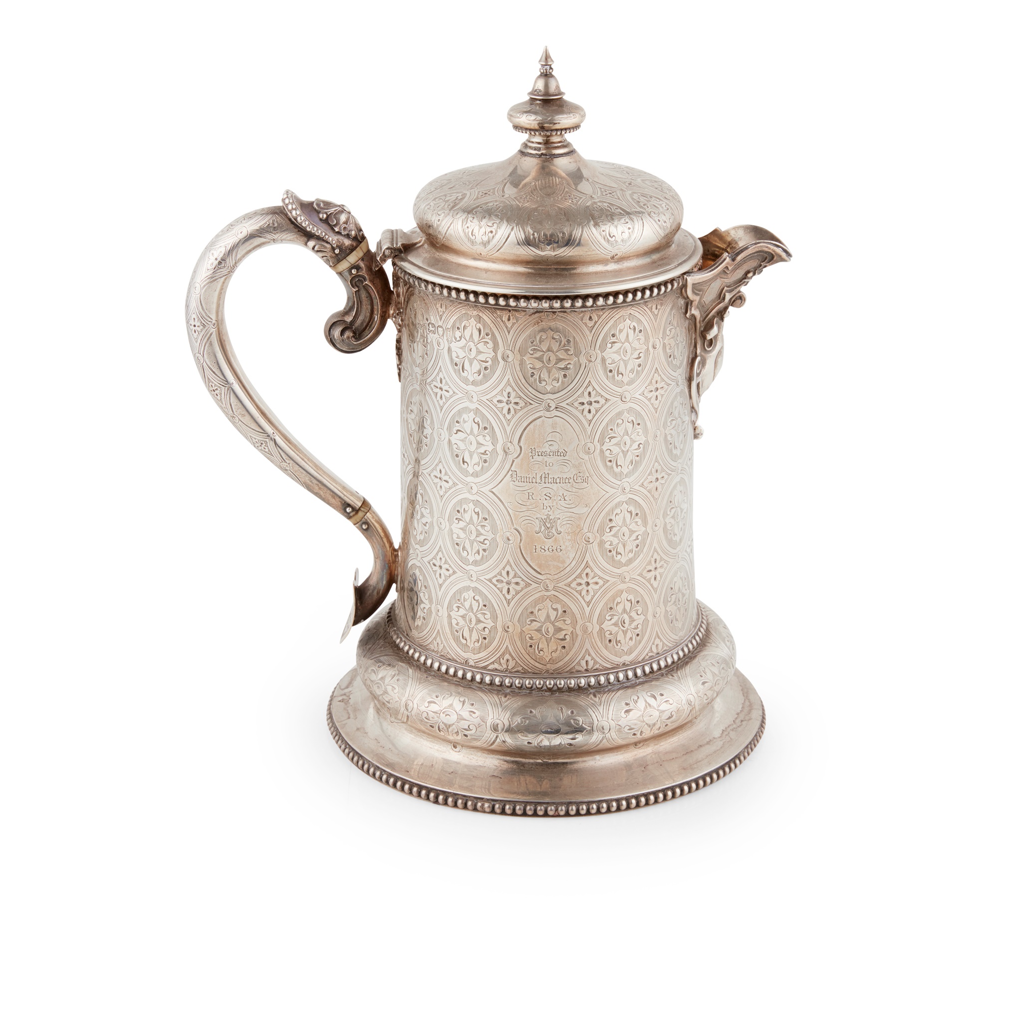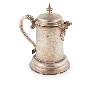 Robert Hennell, London 1864, of traditional cylindrical form, with stepped circular base and short spout, with large S scroll handle and hinged domed cover with knopped finial, the body and lid engraved throughout with floral design, the central cartouche with engraved presentation inscription '1866'