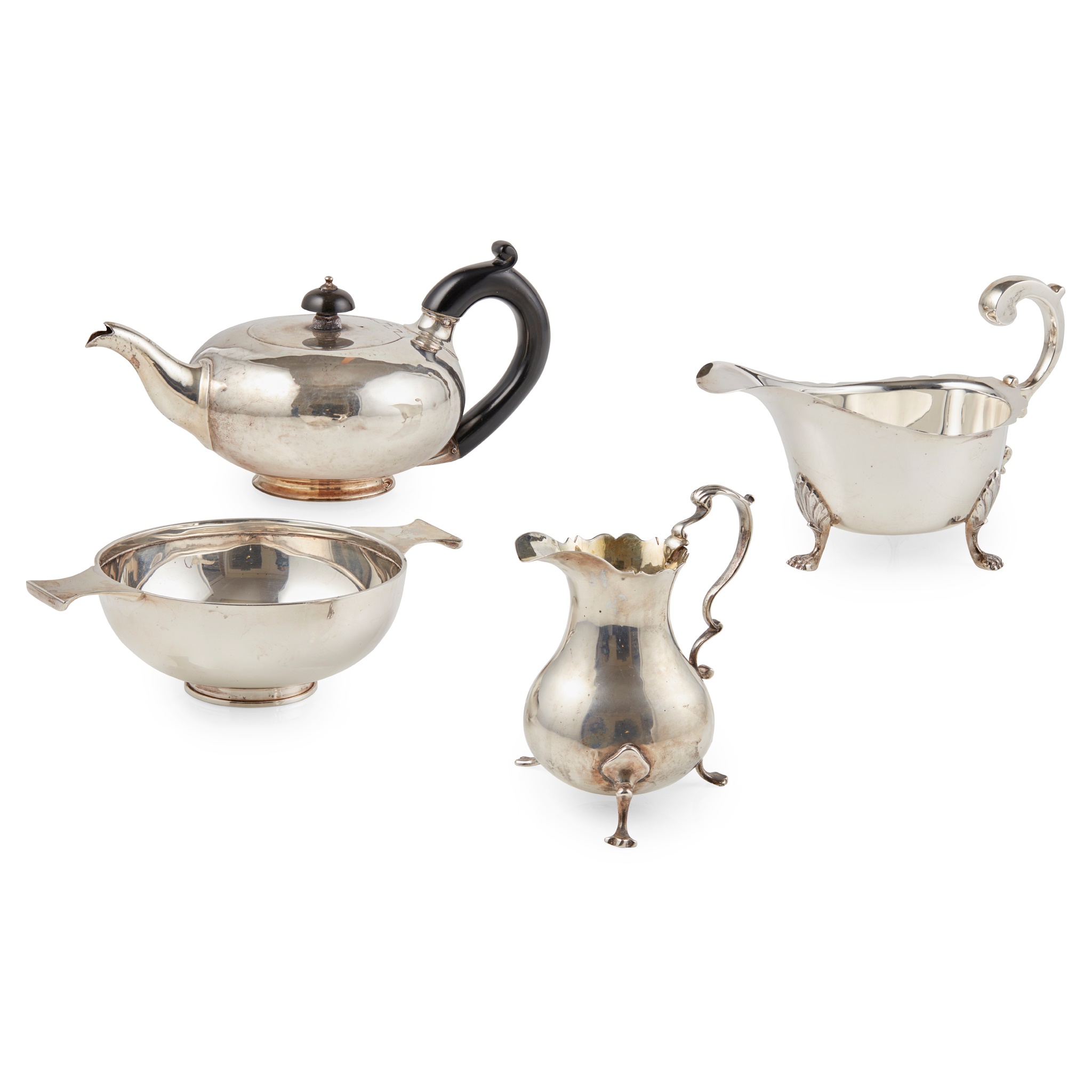 to include a small Victorian teapot, Henry Holland London 1855, of squat plain polished form, hinged lid with stained finial, simple handle, curved spout, collet foot; a quaich of traditional plain form; a mid-18th century small cream jug, marks worn, of baluster form, leaf clasped handle; a sauceboat, modern, plain with wavy rim, scroll handle