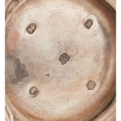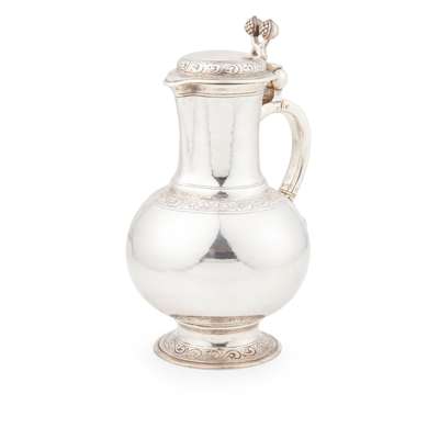 Charles Thomas Fox & George Fox, London 1851, of baluster form with planished finish throughout, an engraved scroll border to the body, hinged lid and foot, the hinged lid with engraved presentation inscription '1852' and an entwined twin berry thumbpiece, ivory inserts to handle
