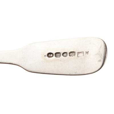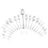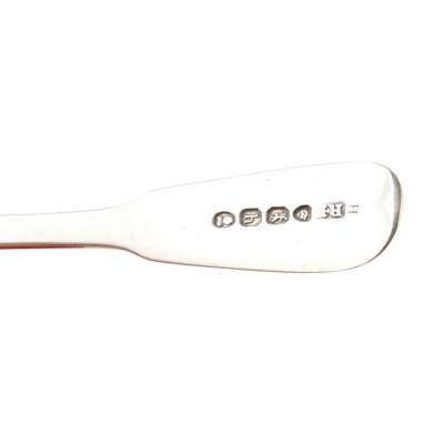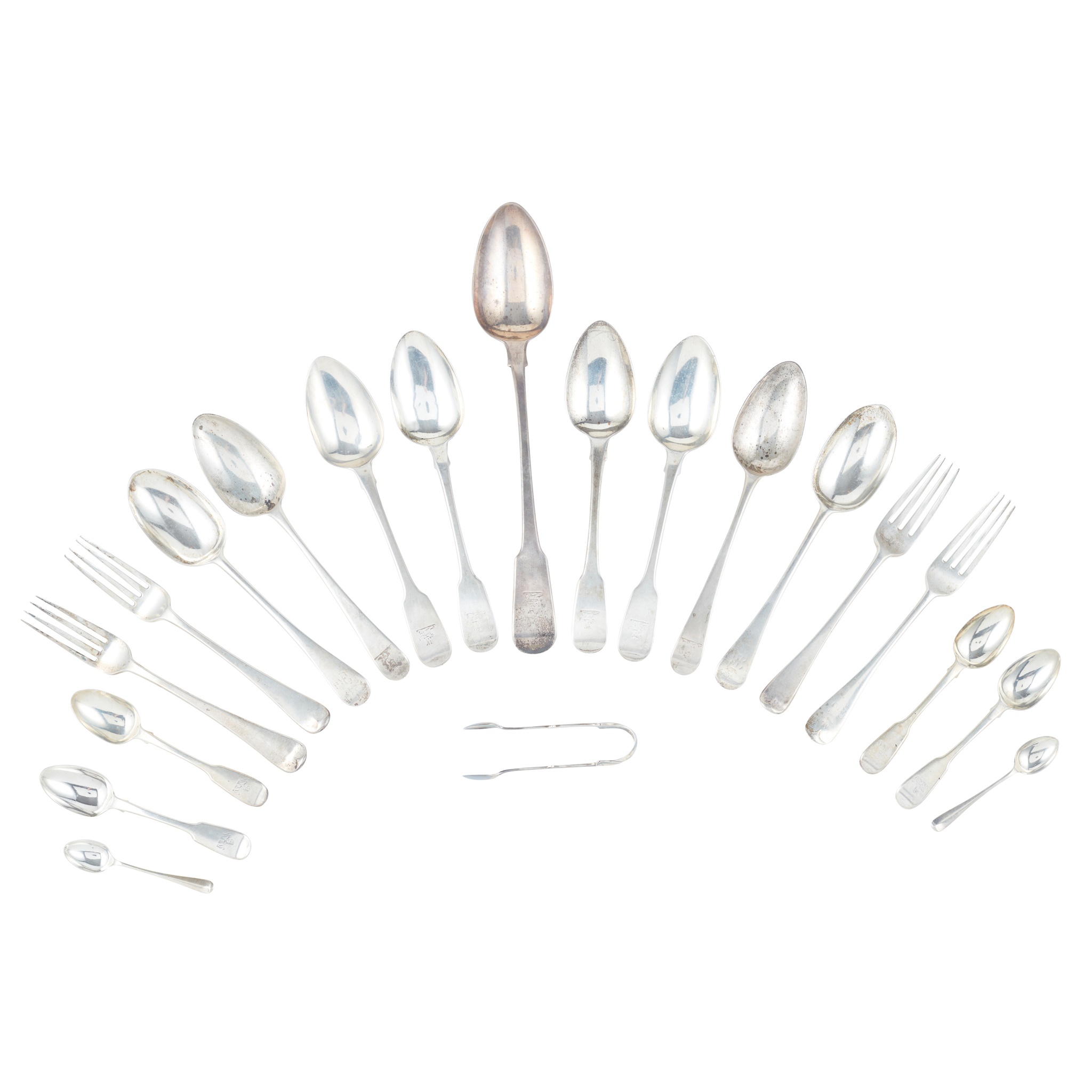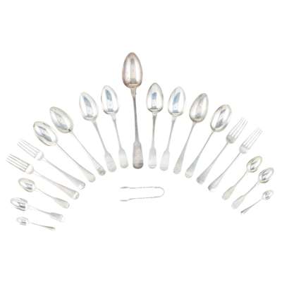 various makers and marks, predominantly London, to include; one basting spoon, four tablespoons, seven teaspoons, all of Fiddle pattern, eight tablespoons of Old English pattern, eight table forks of Hanoverian pattern and a collection of teaspoons and sugar tongs most with engraved crest to terminals