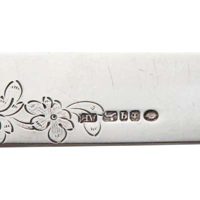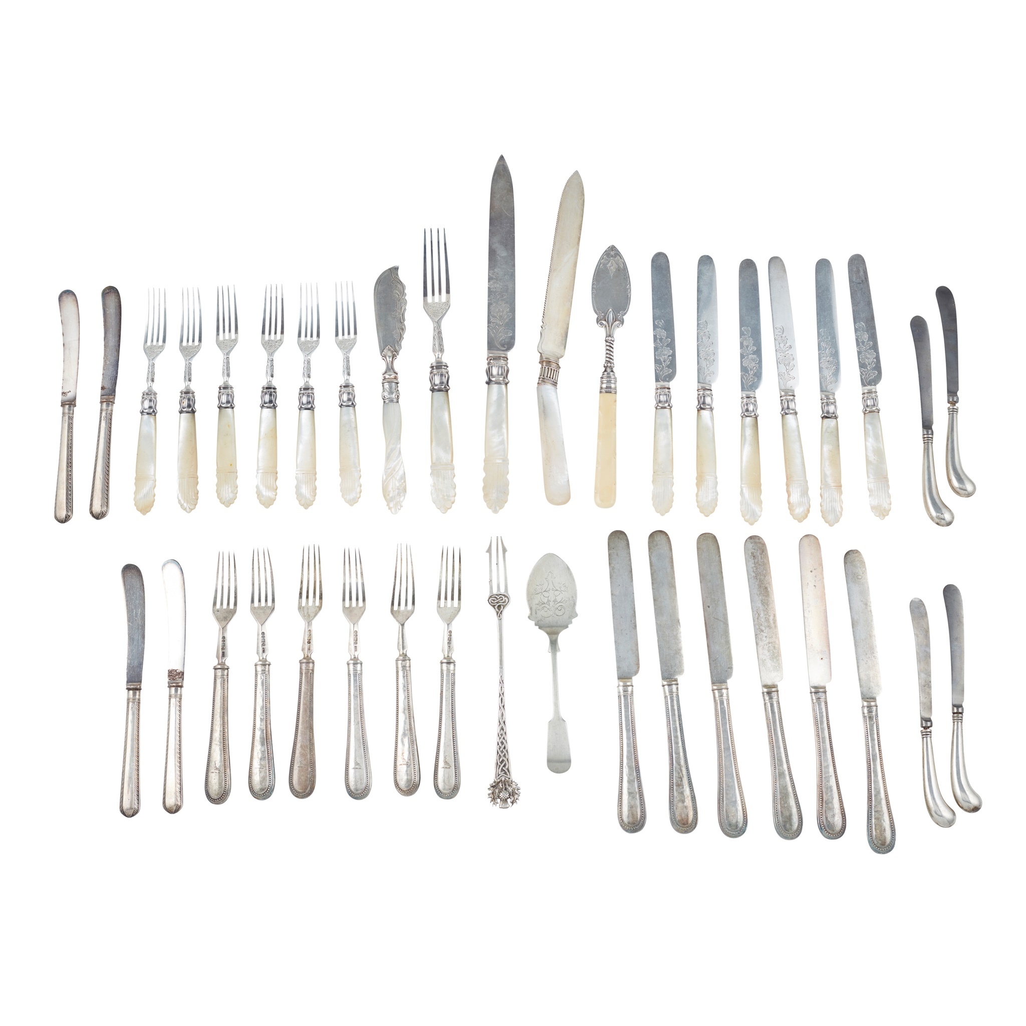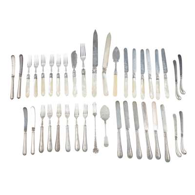 AH, Sheffield 1836, set of twelve fruit knives and forks, engraved decoration with a large knife and matching fork, all with mother-of-pearl handles, stylised anthemion terminals together with various other dessert and fruit knives and forks, and an Iona pickle fork