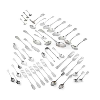 to include, five George III tablespoons, of Fiddle pattern, with four similar dessert spoons and two sauce ladles; together with six dessert forks, 1830, of Fiddle pattern with upturned terminals; a collection of various pieces of flatware including condiment spoons, sauce lades with shell bowls, sugar tongs, and other miscellaneous flatware