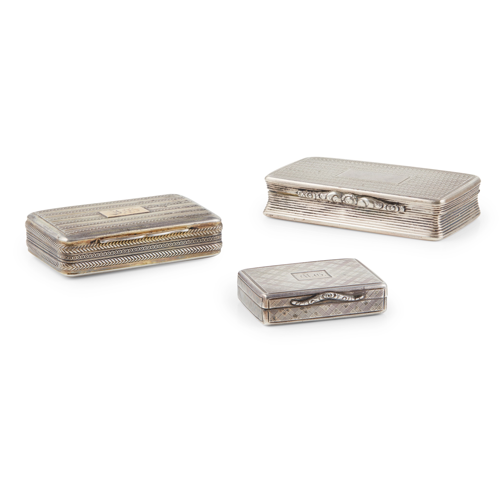 to include; a William IV small vinaigrette, Nathaniel Mills, Birmingham 1833, checkered engraved cover, engraved cartouche to the hinged lid; together with a George III snuff box, Samuel Pemberton Birmingham, line engraved case; and a William IV snuff box, Thomas Smith, Birmingham, with an engine-turned case