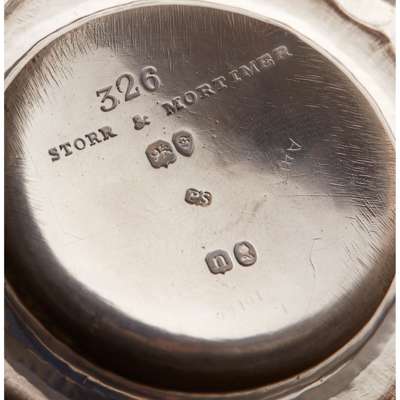 Paul Storr, London 1828 of squat panelled form with engraved armorial to sides, undulating rim, with leaf clasped S scroll handle and moulded circular foot