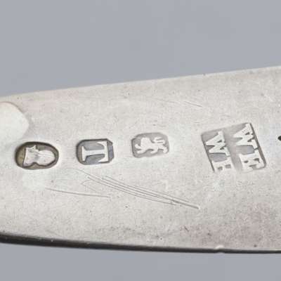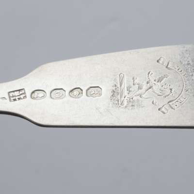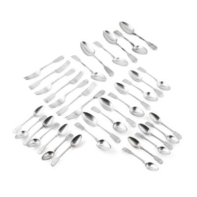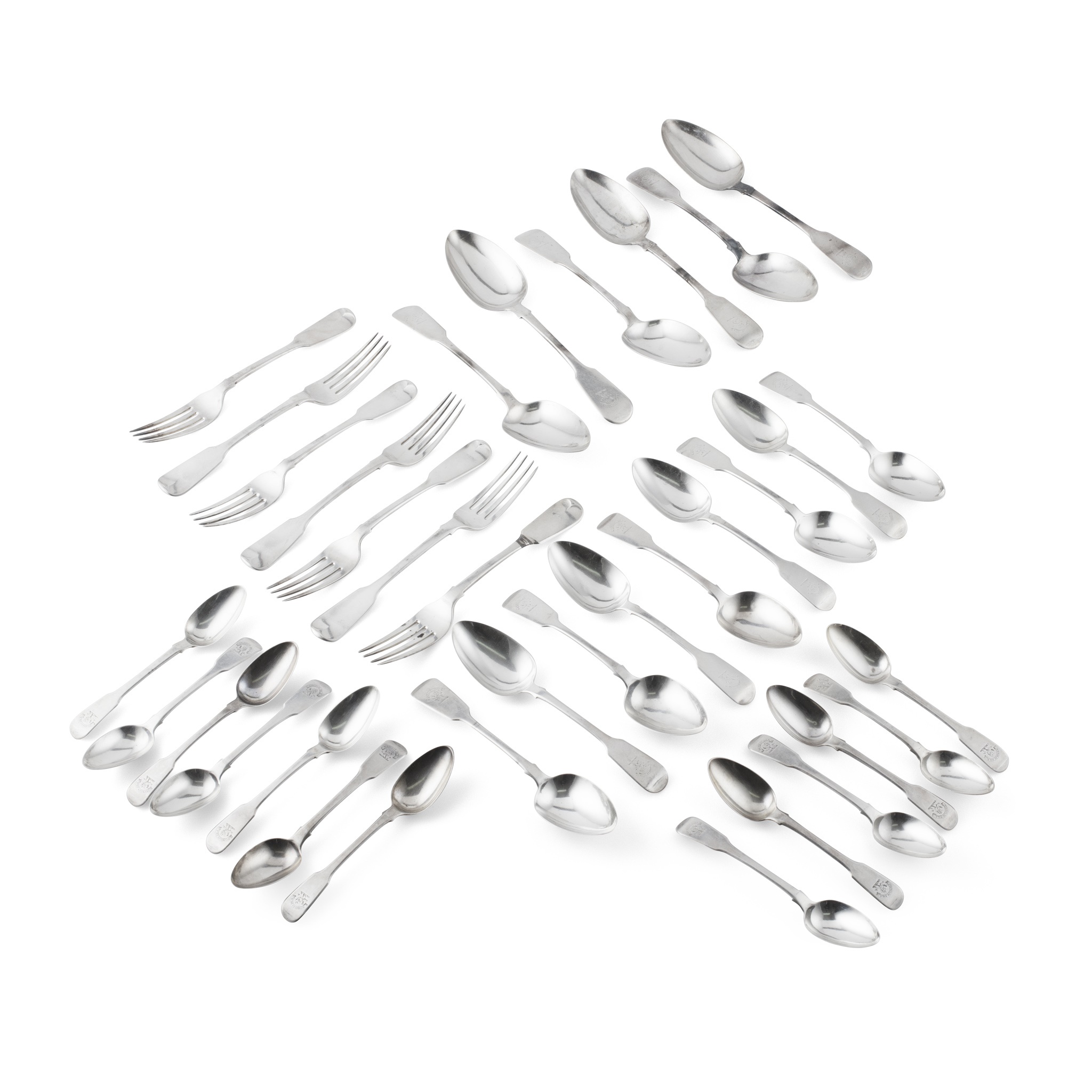 comprising, six tablespoons, 1827, seven table forks, 1829, nine dessert spoons, 1829/30 and thirteen teaspoons, all with engraved crest and motto to terminals