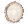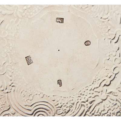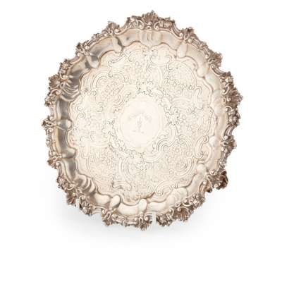 S C Yonge, Sheffield 1826, with cast shell border, chased scroll and floral decoration to the flat with engraved crest and motto, raised on three cast bracket feet