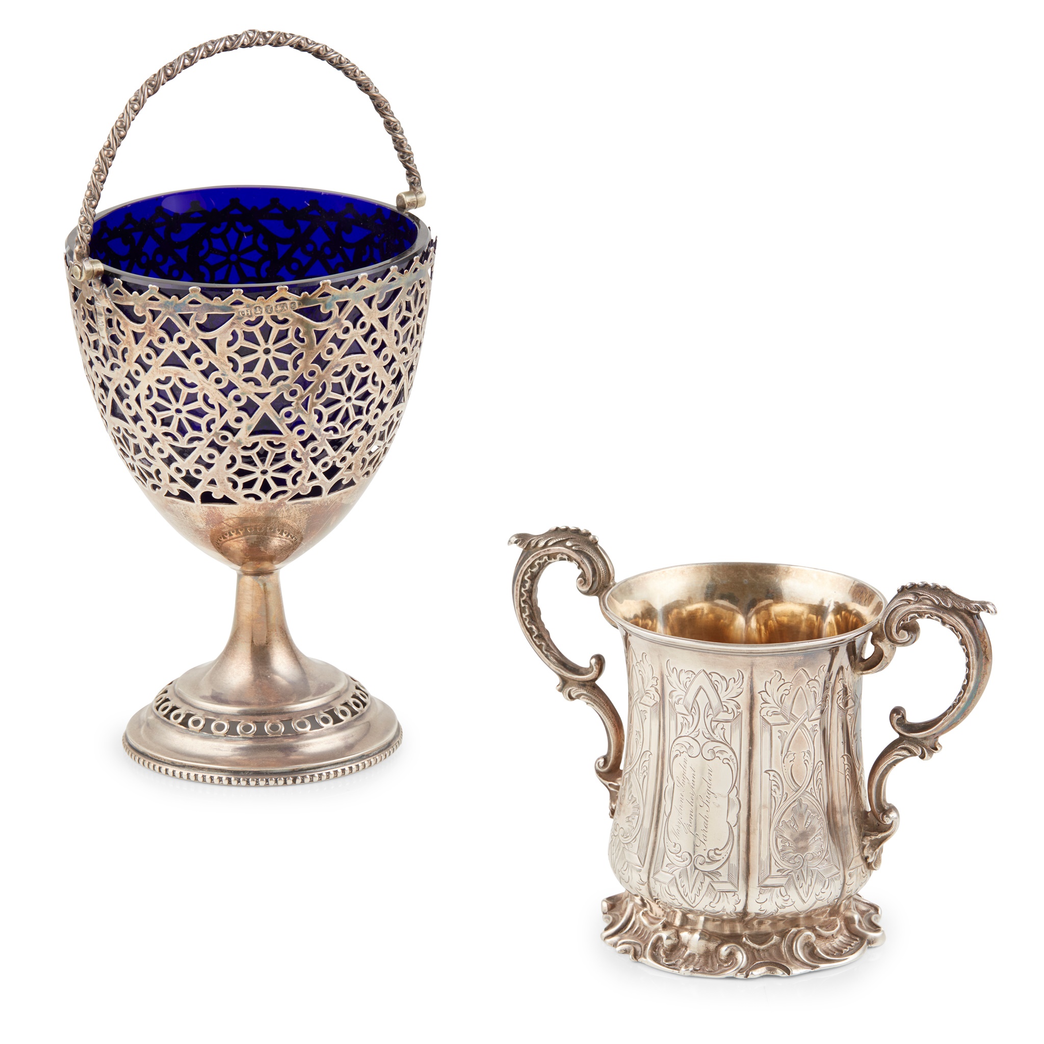 John Harrison & Co., Sheffield 1821, of vase form, pierced body, swing-handle, pierced foot; together with a Victorian twin-handled christening cup, Charles Reily & George Storer, London 1849, leaf clasped handles, engraved panelled body, cast spreading base