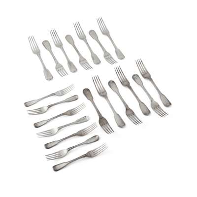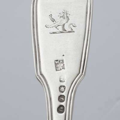 William Eley, William Fearn & William Chawner, London 1813, of Fiddle and Thread pattern, with crest engraved to reverse of the terminal; together with a set of matching seven dessert forks