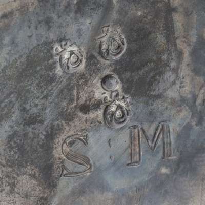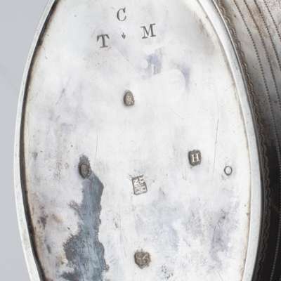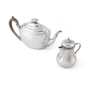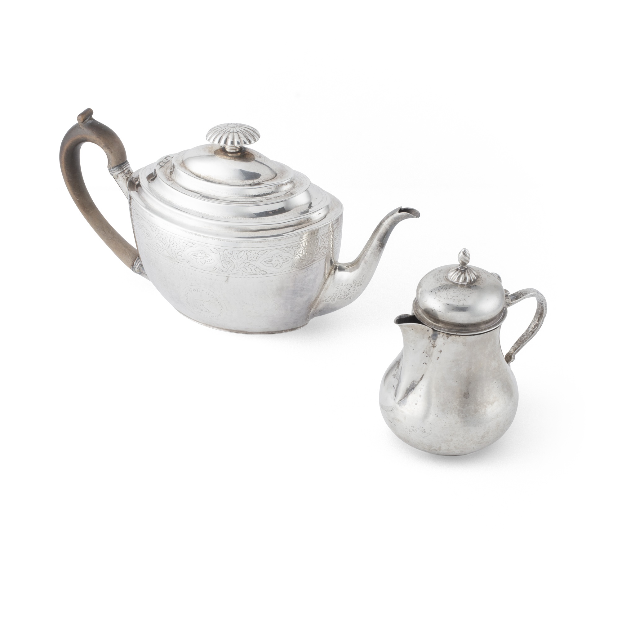 Duncan Urquhart & Naphtali Hart, London 1803, of oval form, with bright-cut engraved floral border, engraved circular cartouche to either side; together with a continental waterpot, of baluster form, the hinged lid with flame finial