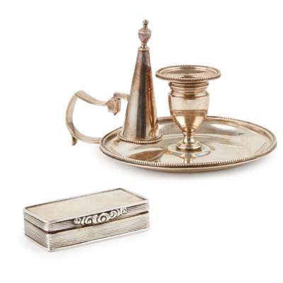 Richard Cooke, London 1800, of circular conventional form, beaded borders, with matching snuffer; together with a snuff box, Edward Smith, Birmingham 1827, of rectangular form, cast thumbpiece, engraved cartouche